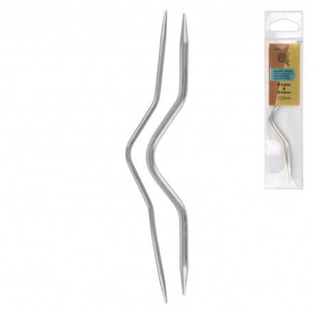 Tricoter des torsades sera un jeu d'enfant grâce à ces aiguilles à la forme si particulière. La forme coudée permet de croiser facilement les mailles sans risquer de les perdre. Ce lot est composé de 2 aiguilles de diamètres différents : une de 2,5mm et une de 4mm. Elles sont en aluminium et mesurent 12,5cm de long.