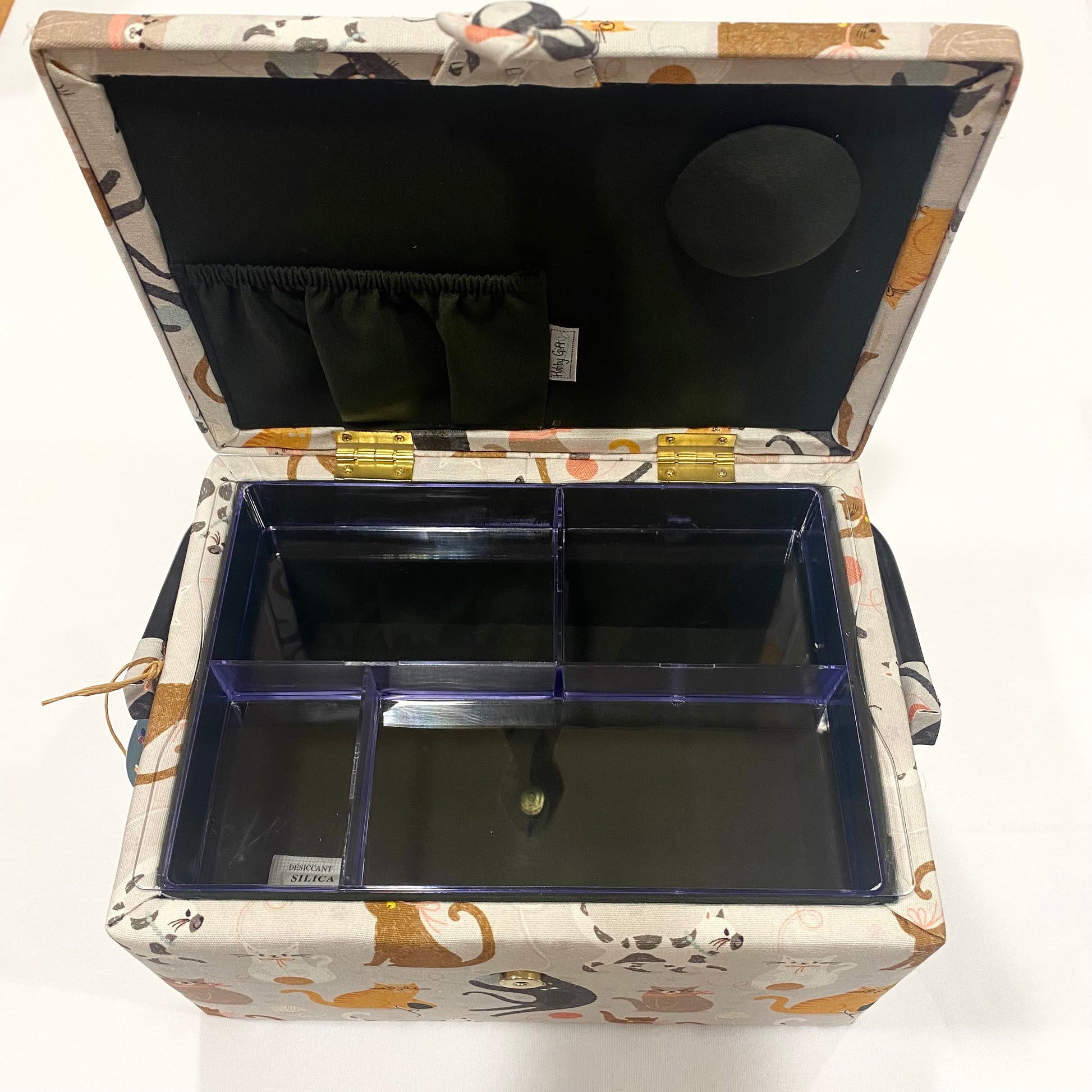 Vous cherchez votre nouveau compagnon pour vos projets créatifs ? Eh bien le voilà ! Une très jolie boite à ouvrages qui comporte un grand espace principale surmonté d'un rangement transparent séparé en plusieurs segments. Le couvercle abrite également une pochette élastiquée ainsi qu'un coussin rembourré pouvant accueillir diverses épingles et aiguilles. Grâce à sa poignée vous pourrez l'emmener partout avec vous !