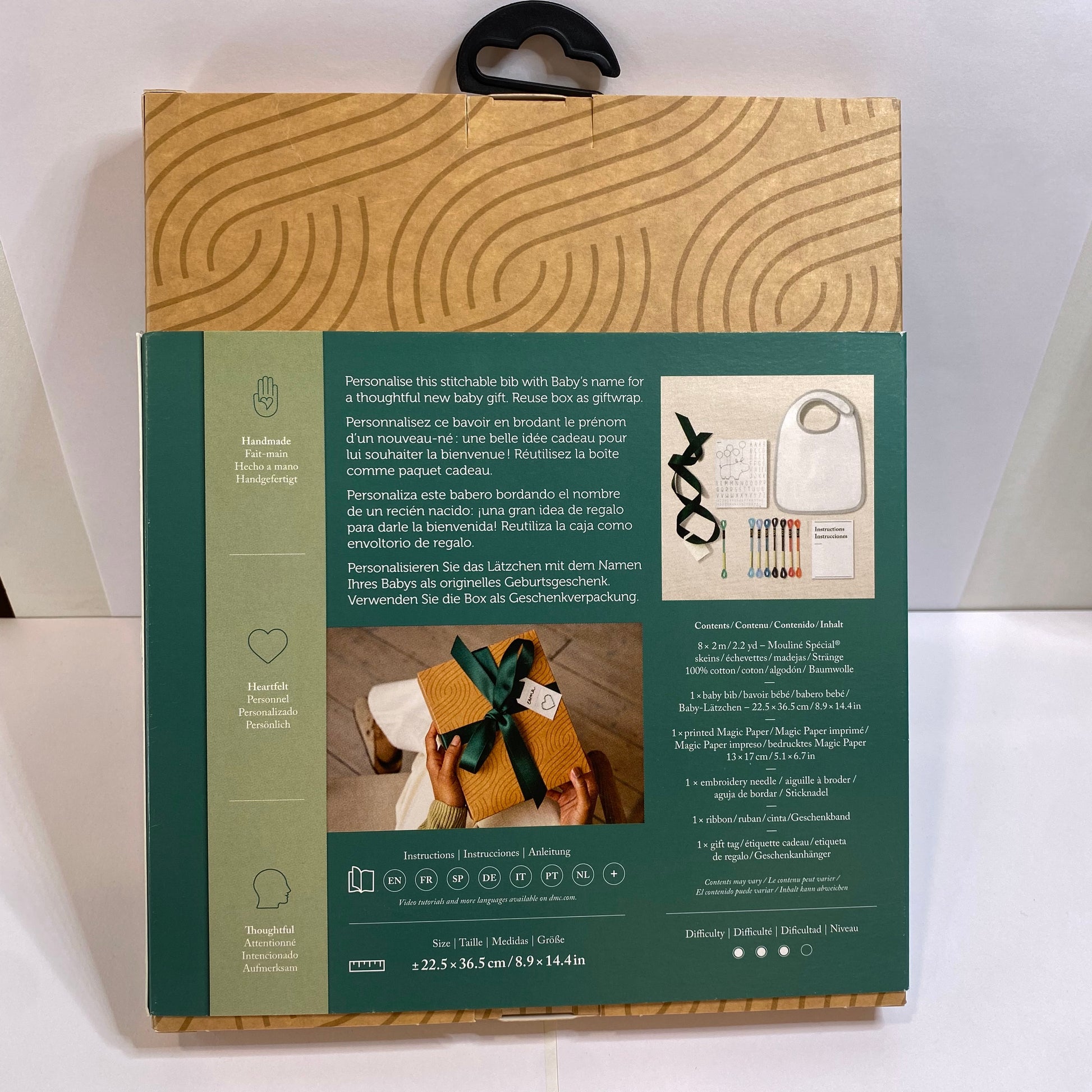 Il contient tout ce qu'il faut pour broder le bavoir : le bavoir, du Magic Paper imprimé, des fils à broder, une aiguille à broder, un ruban pour faire un paquet cadeau et une étiquette cadeau.