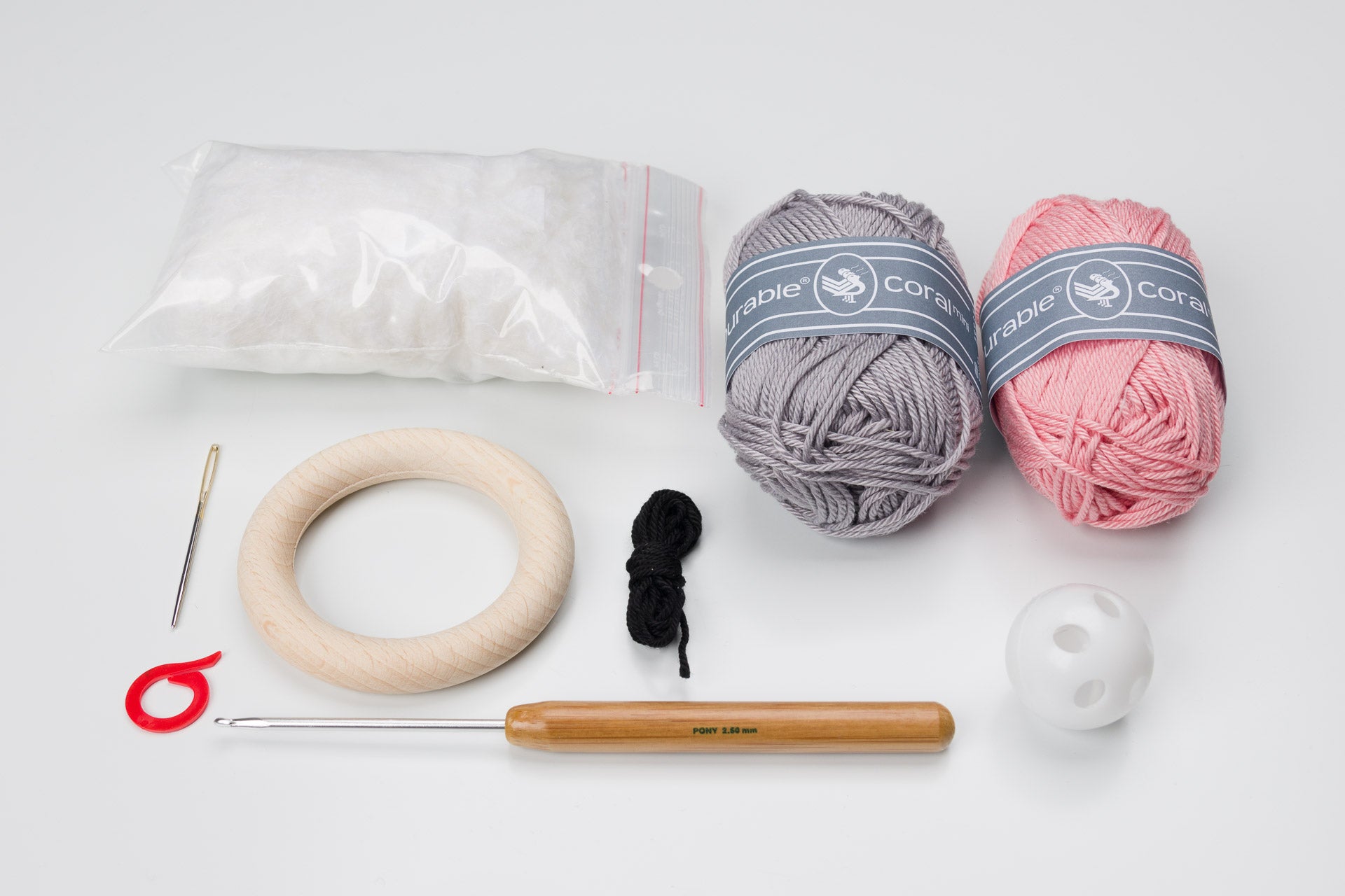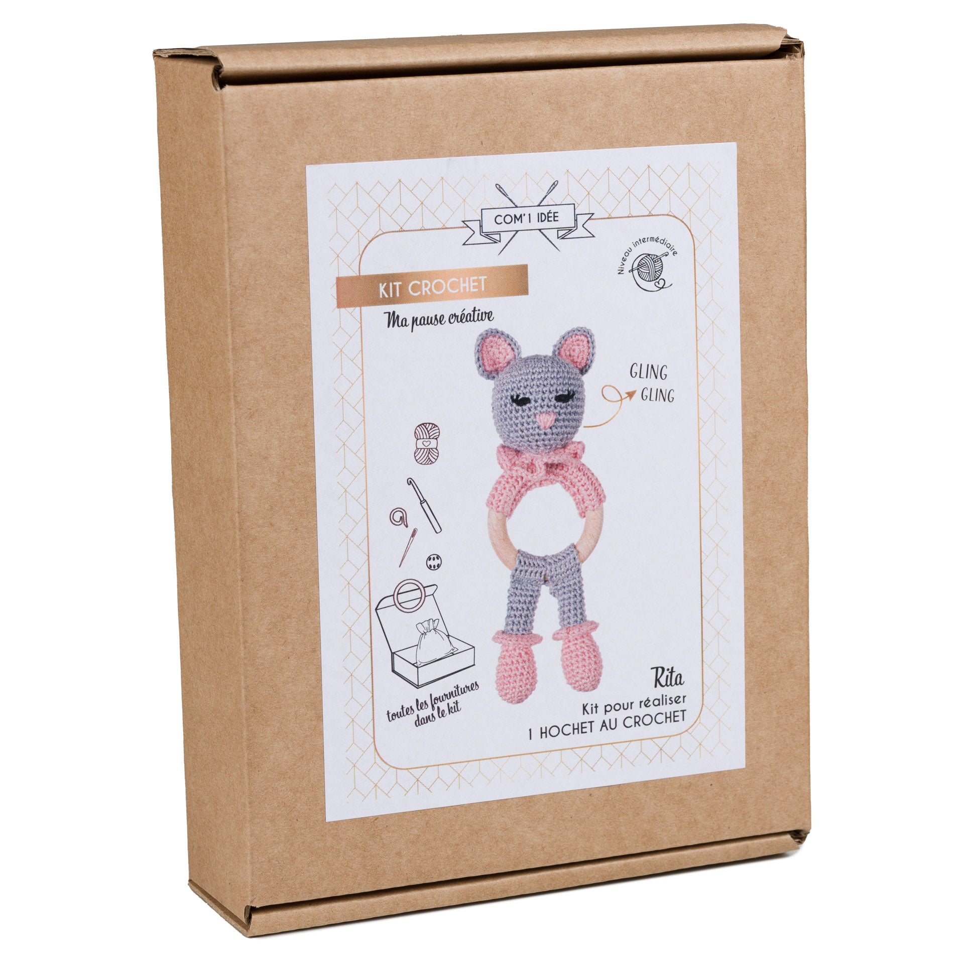 Ce kit crochet contient tout le nécessaire pour réaliser un hochet au crochet Rita en forme de souris. Il est composé de :