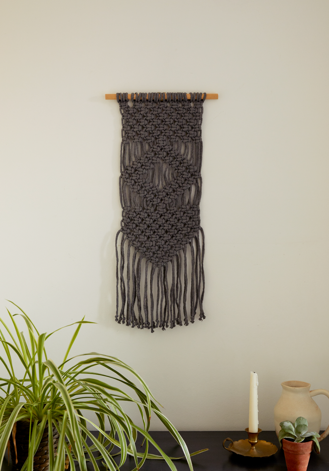 Grâce à ce kit vous pourrez vous initier à l'art des différents noeuds utilisés dans le macramé et obtenir une jolie suspension murale. Ce kit contient une pelote d'écovita 12 de chez DMC, les instructions et une barre de suspension en bois.