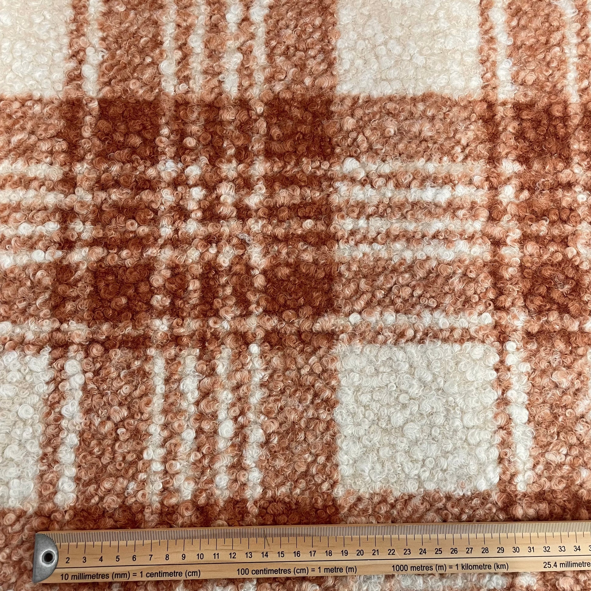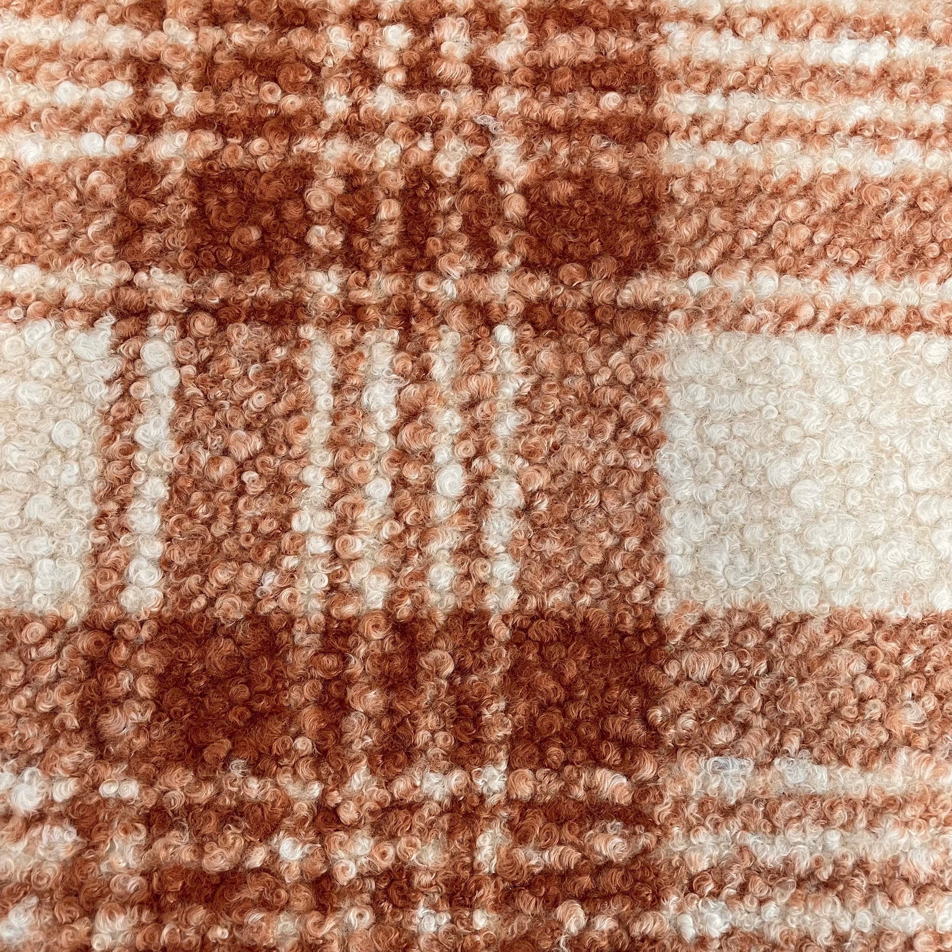 Tissu effet lainage bouclettes à carreaux orange. Ce tissu est très douillet et confortable. Il vous tiendra chaud dans la réalisation d'une veste courte comme d'un manteau. Il ne comporte pas de laine, de cette manière, il n'y a pas de risque d'allergie ou que ça vous gratte. Il peut aussi servir pour la réalisation d'accessoires tels que des sacs, des chapeaux, des plaids,...