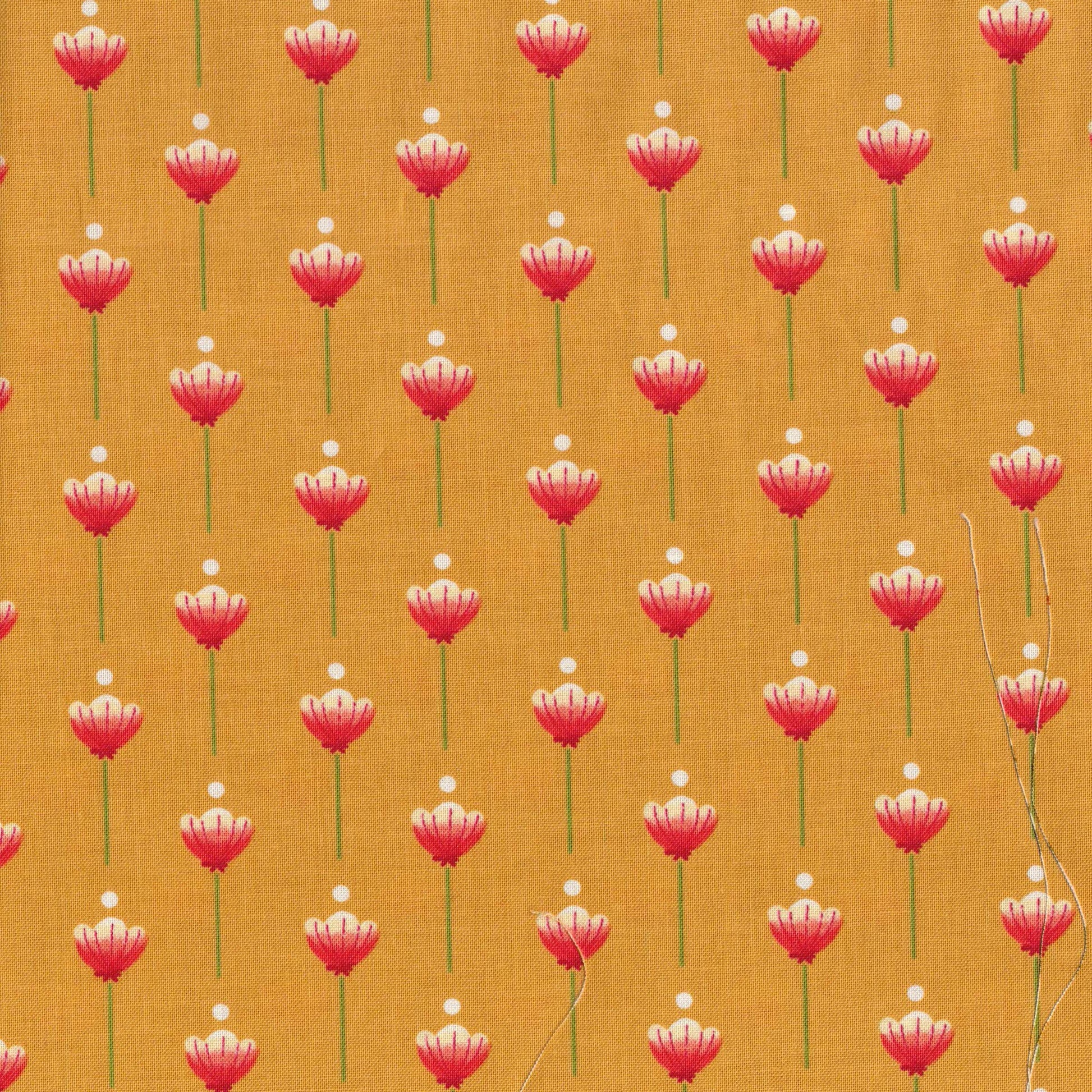 Tissu en 100% coton ocre à imprimé floral. Il est idéal pour la réalisation d'accessoires : sacs, trousses, taies d'oreiller, sacs à tarte, tabliers... comme pour la réalisation de vêtements : robe, chemisier, top,... C'est un coton tissé serré, il est donc un peu plus épais et plus résistant que la popeline de coton. Il peut convenir pour le cartonnage.
