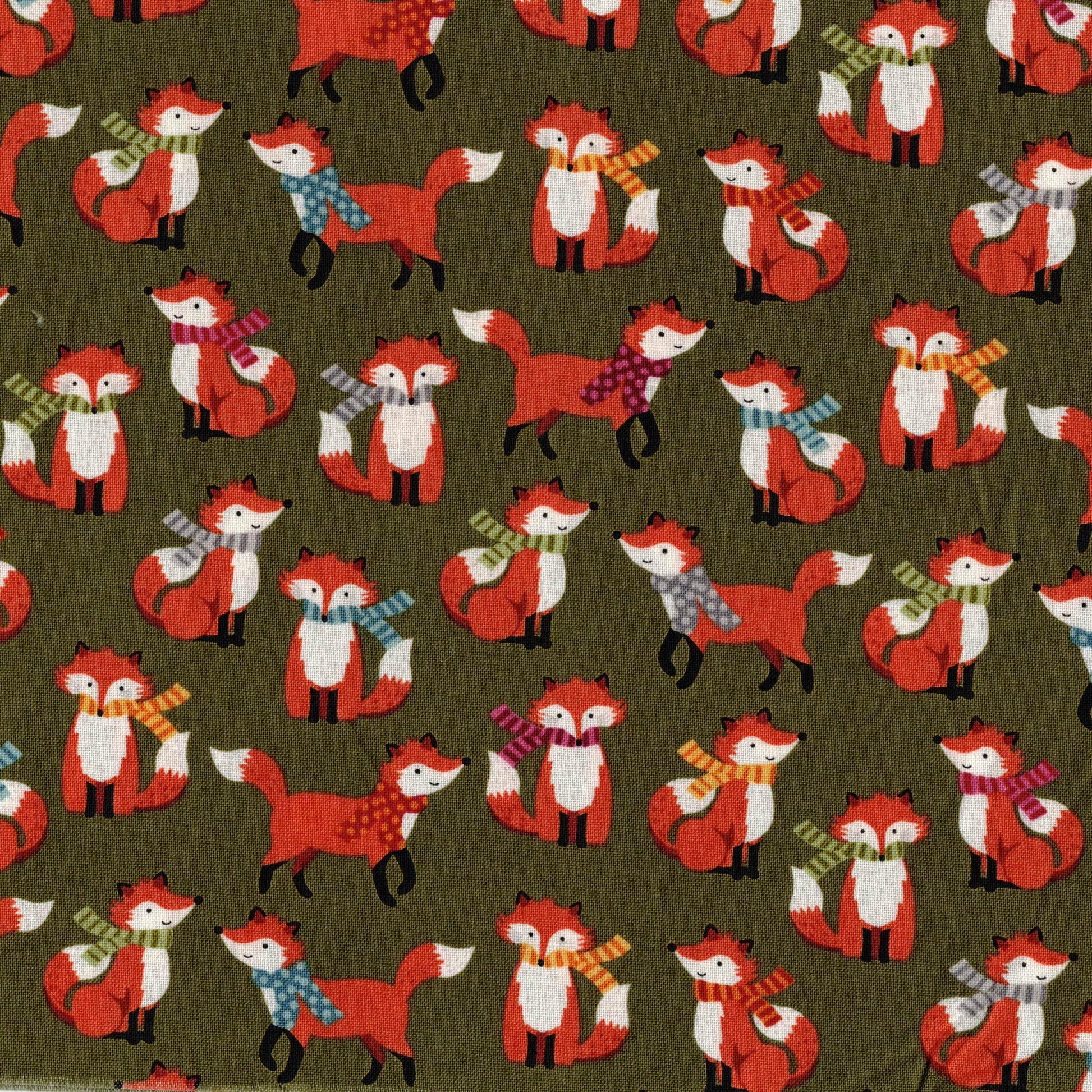 Tissu en 100% coton à imprimé renards sur fond vert kaki. Il est idéal pour la réalisation d'accessoires : sacs, trousses, taies d'oreiller, sacs à tarte, tabliers... comme pour la réalisation de vêtements : robe, chemisier, top,... C'est un coton tissé serré, il est donc un peu plus épais et plus résistant que la popeline de coton. Il peut convenir pour le cartonnage.