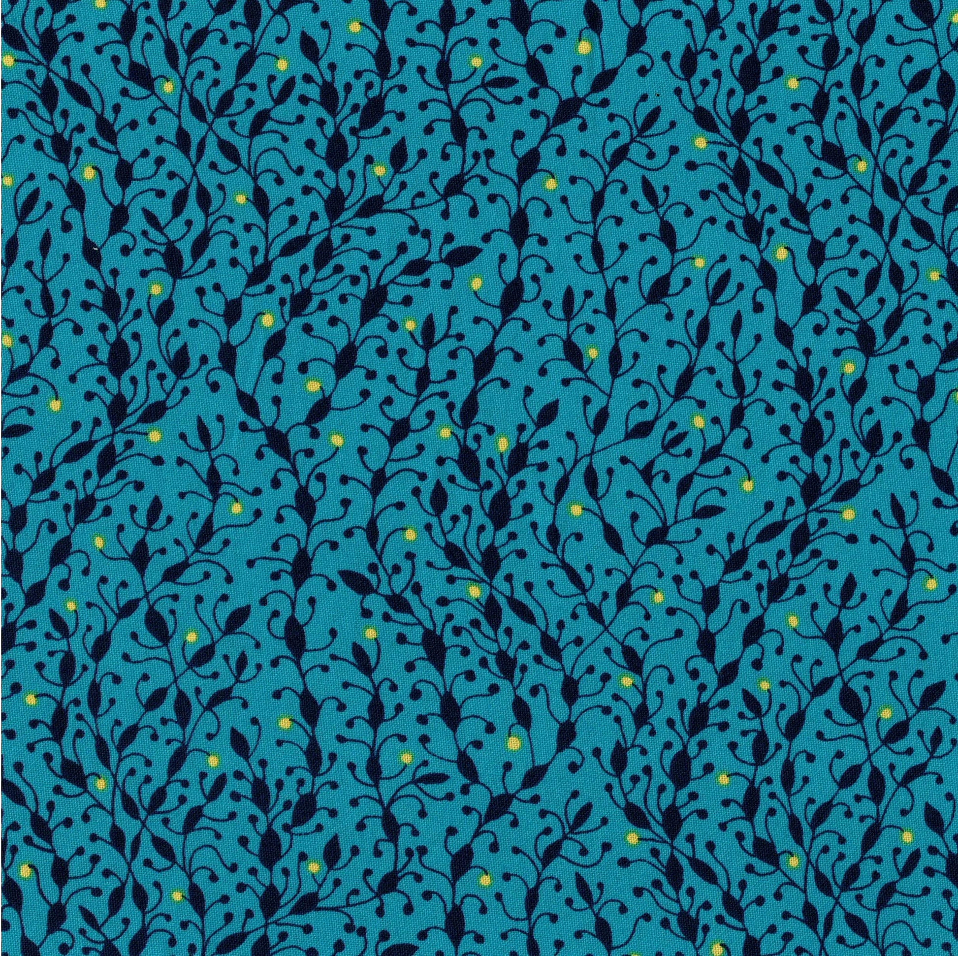 Tissu en 100% coton bleu turquoise à motifs marine et jaunes. Il est idéal pour la réalisation d'accessoires : sacs, trousses, taies d'oreiller, sacs à tarte, tabliers... comme pour la réalisation de vêtements : robe, chemisier, top,... C'est un coton tissé serré, il est donc un peu plus épais et plus résistant que la popeline de coton. Il peut convenir pour le cartonnage.