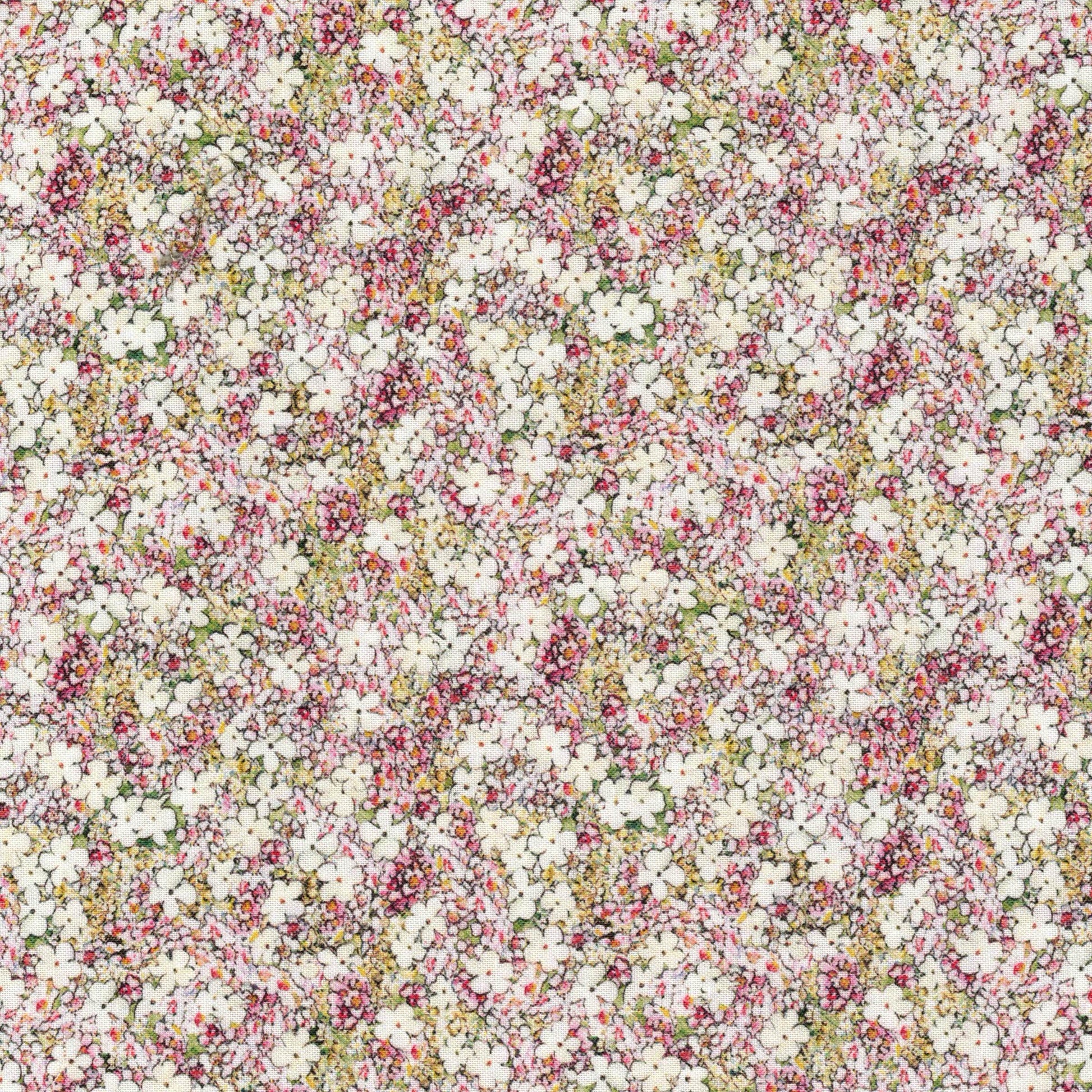 Tissu en 100% coton à imprimé fleurettes écru, roses et vertes. Il est idéal pour la réalisation d'accessoires : sacs, trousses, taies d'oreiller,... comme pour la réalisation de vêtements : robe, chemisier, top,... C'est un coton tissé serré, il est donc un peu plus épais et plus résistant que la popeline de coton. Il peut aussi être utilisé pour faire du cartonnage.