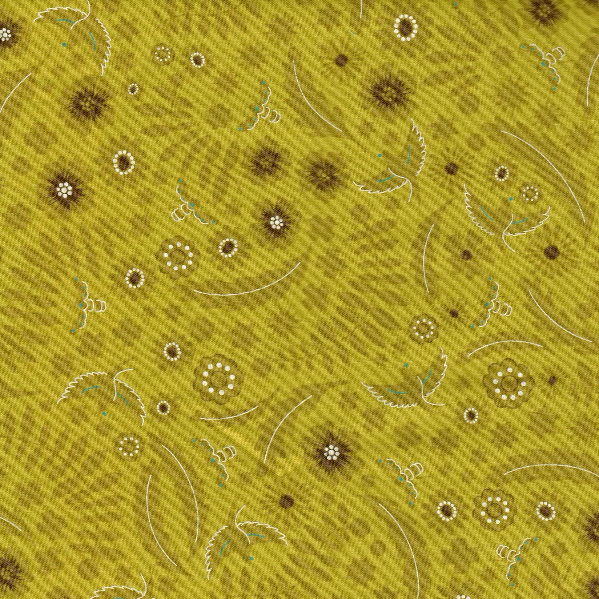 Tissu en 100% coton vert absinthe à motifs divers. Il est idéal pour la réalisation d'accessoires : sacs, trousses, taies d'oreiller, sacs à tarte, tabliers... comme pour la réalisation de vêtements : robe, chemisier, top,... C'est un coton tissé serré, il est donc un peu plus épais et plus résistant que la popeline de coton. Il peut convenir pour le cartonnage.
