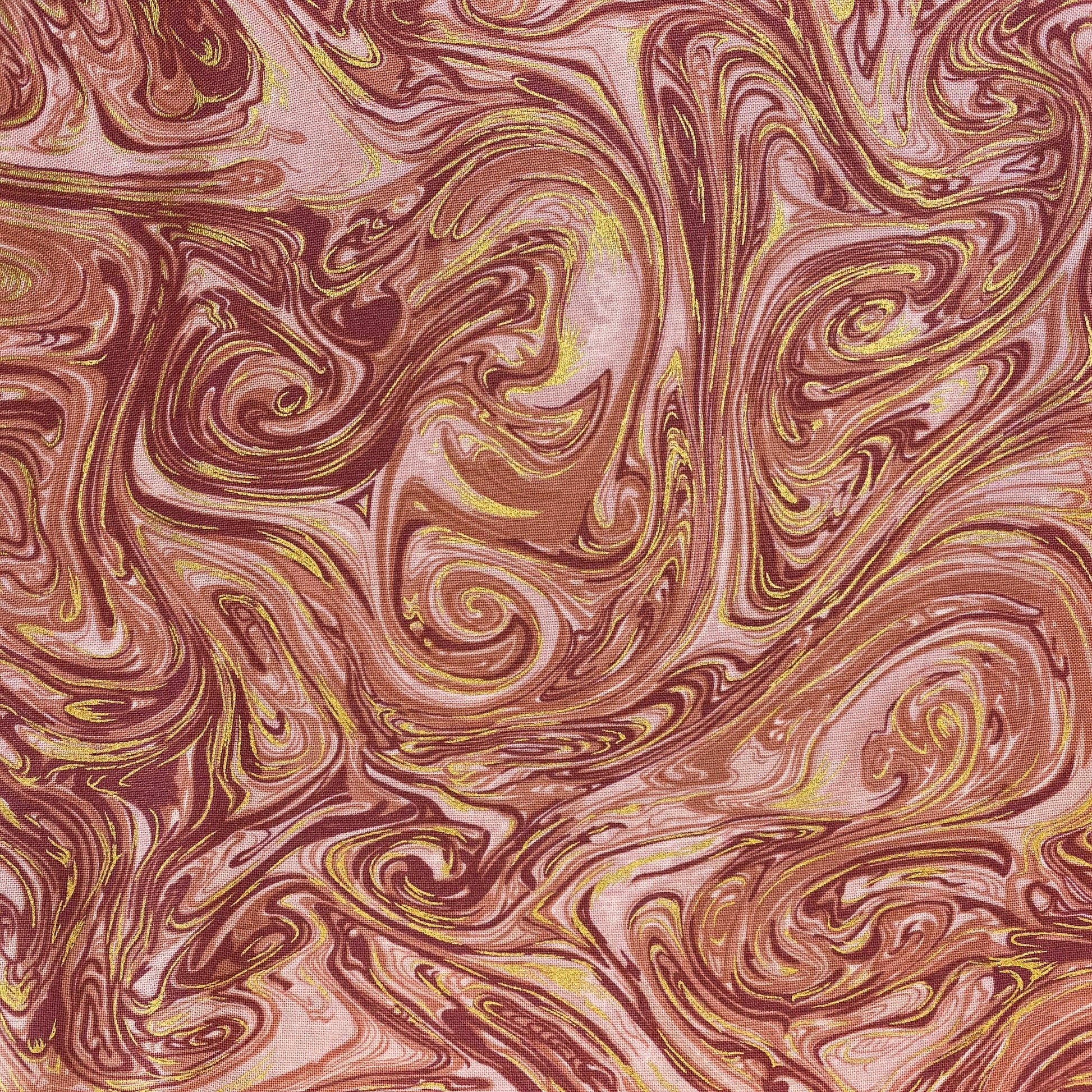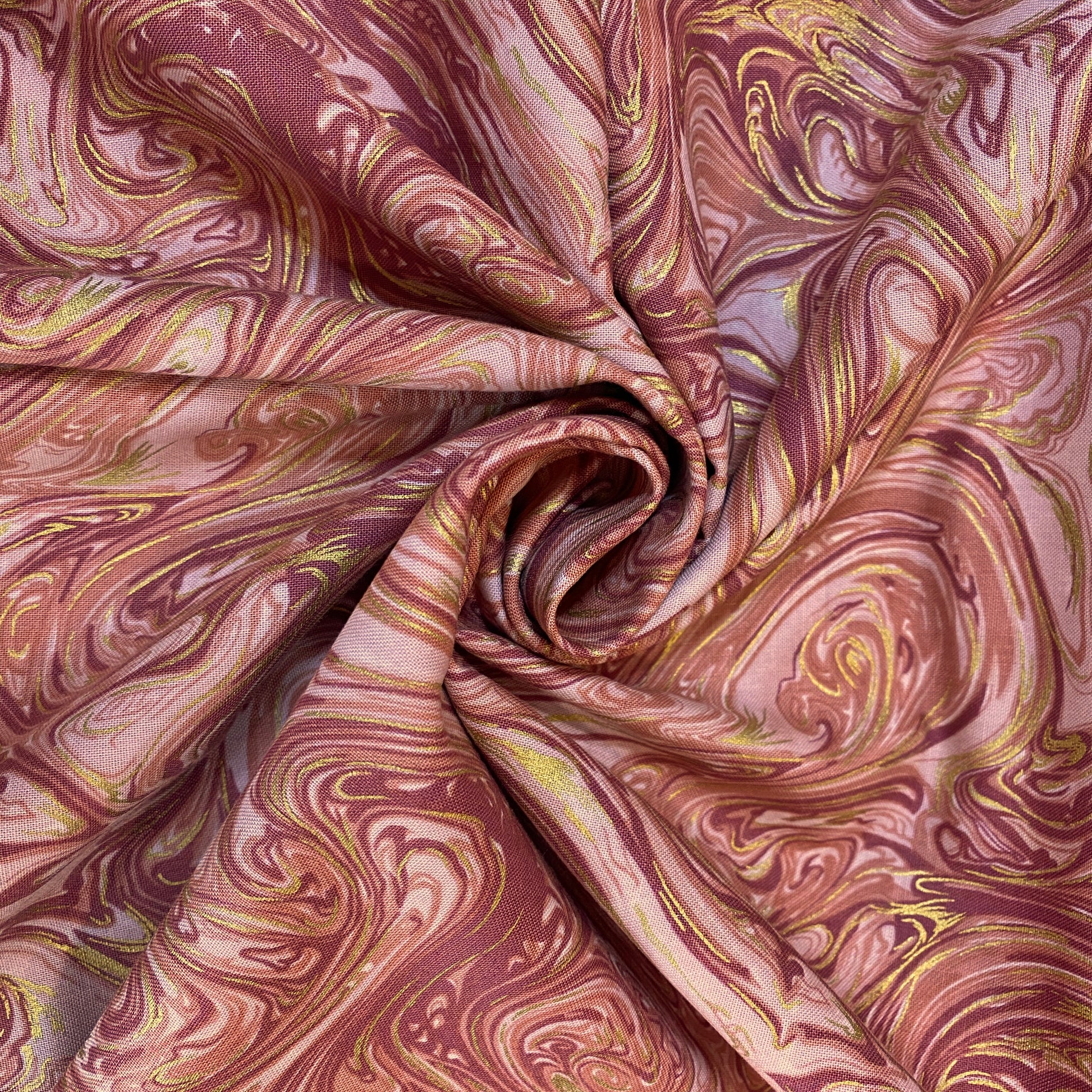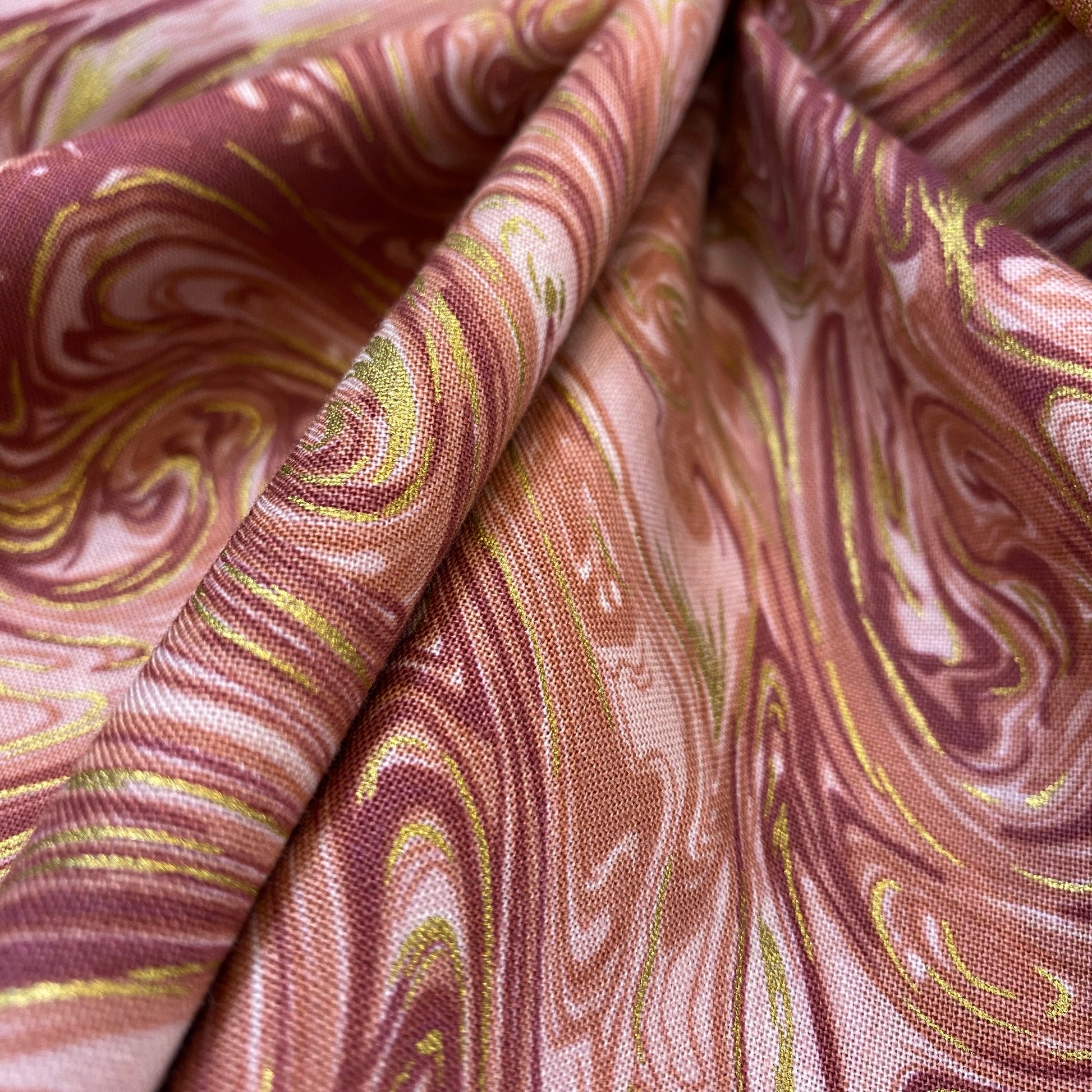 Tissu en 100% coton à imprimé marbré rose et or. Ce tissu comporte de légères touches dorées qui soulignent le motif marbré. Il est idéal pour la réalisation d'accessoires : sacs, trousses, taies d'oreiller,... comme pour la réalisation de vêtements : robe, chemisier, top,... C'est un coton tissé serré, il est donc un peu plus épais et plus résistant que la popeline de coton.