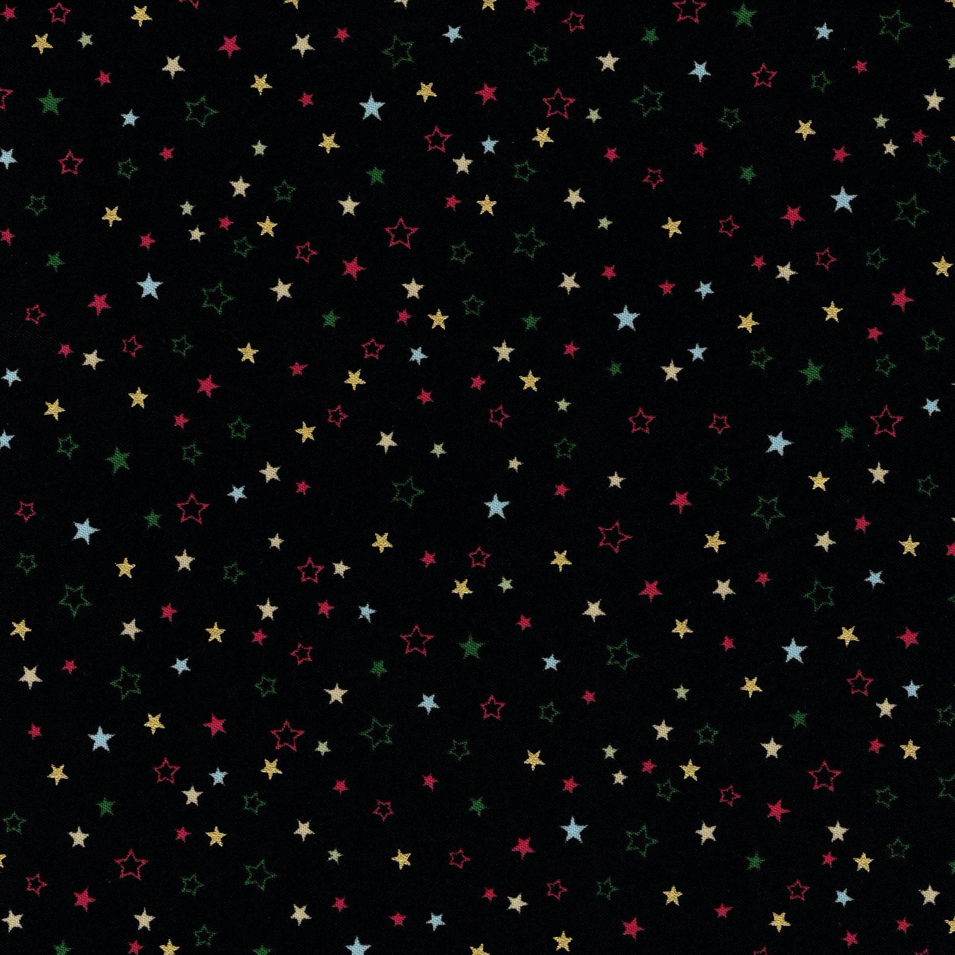 Tissu en 100% coton noir à étoiles couleurs multicolores. Il est idéal pour la réalisation d'accessoires : sacs, trousses, taies d'oreiller, sacs à tarte, tabliers... comme pour la réalisation de vêtements : robe, chemisier, top,... C'est un coton tissé serré, il est donc un peu plus épais et plus résistant que la popeline de coton. Il peut convenir pour le cartonnage.