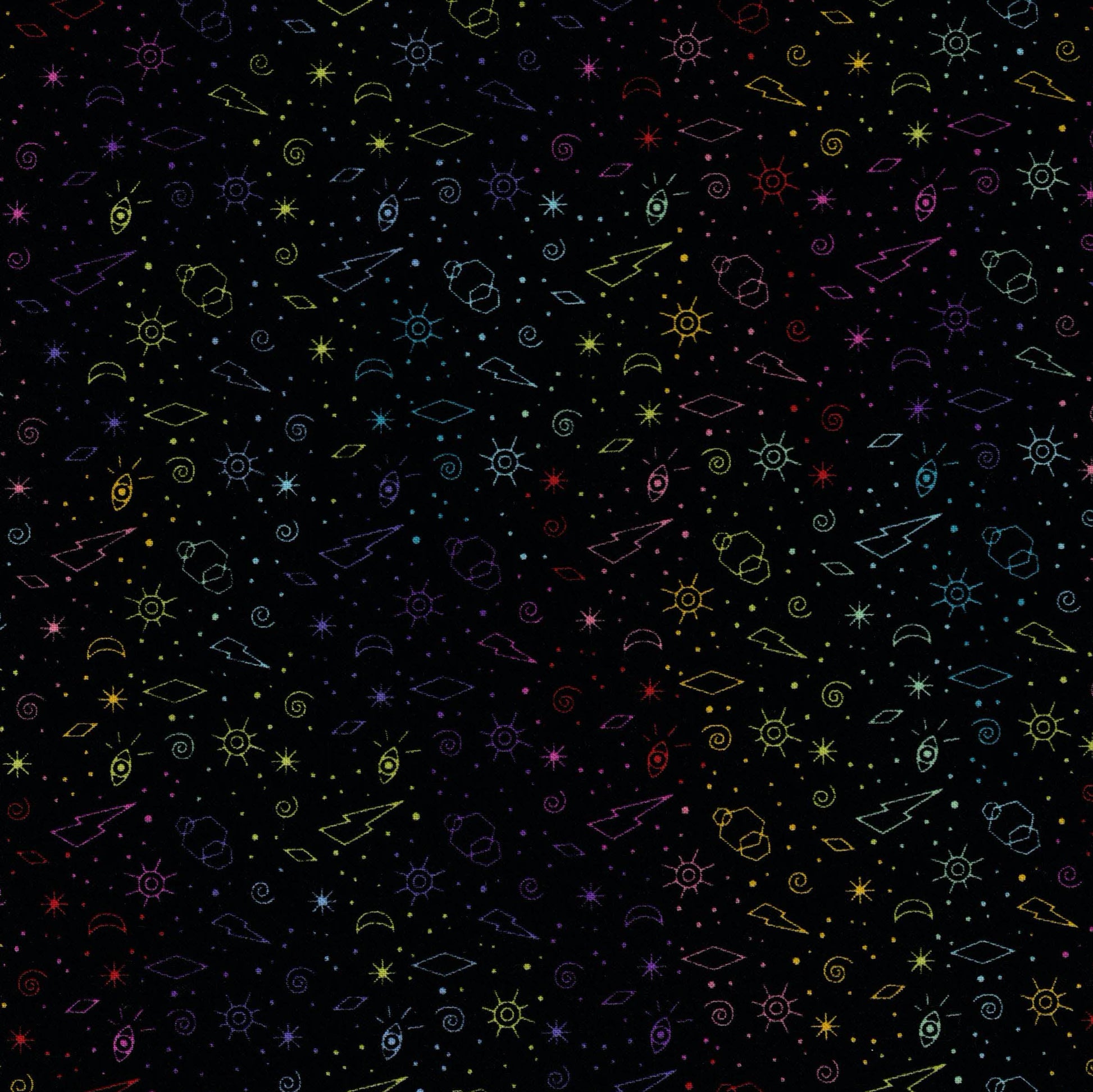Tissu en 100% coton noir à petits motifs multicolores. Il est idéal pour la réalisation d'accessoires : sacs, trousses, taies d'oreiller, sacs à tarte, tabliers... comme pour la réalisation de vêtements : robe, chemisier, top,... C'est un coton tissé serré, il est donc un peu plus épais et plus résistant que la popeline de coton. Il peut convenir pour le cartonnage.