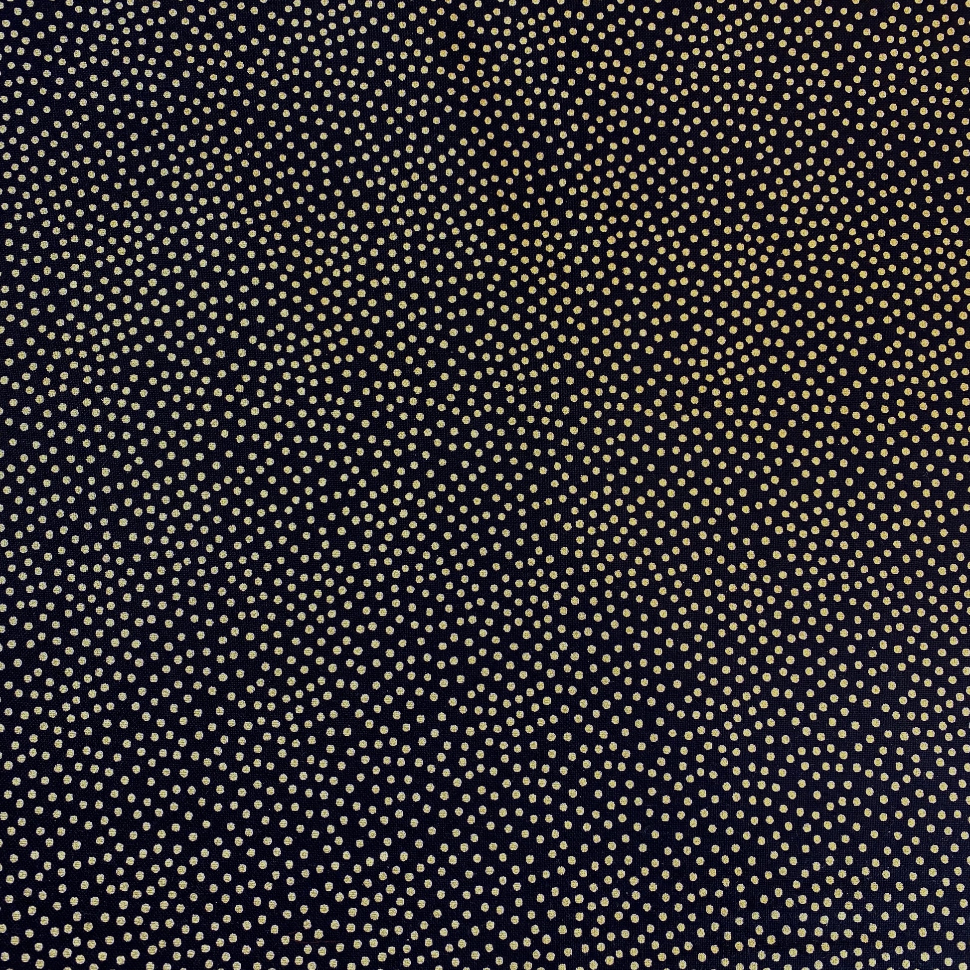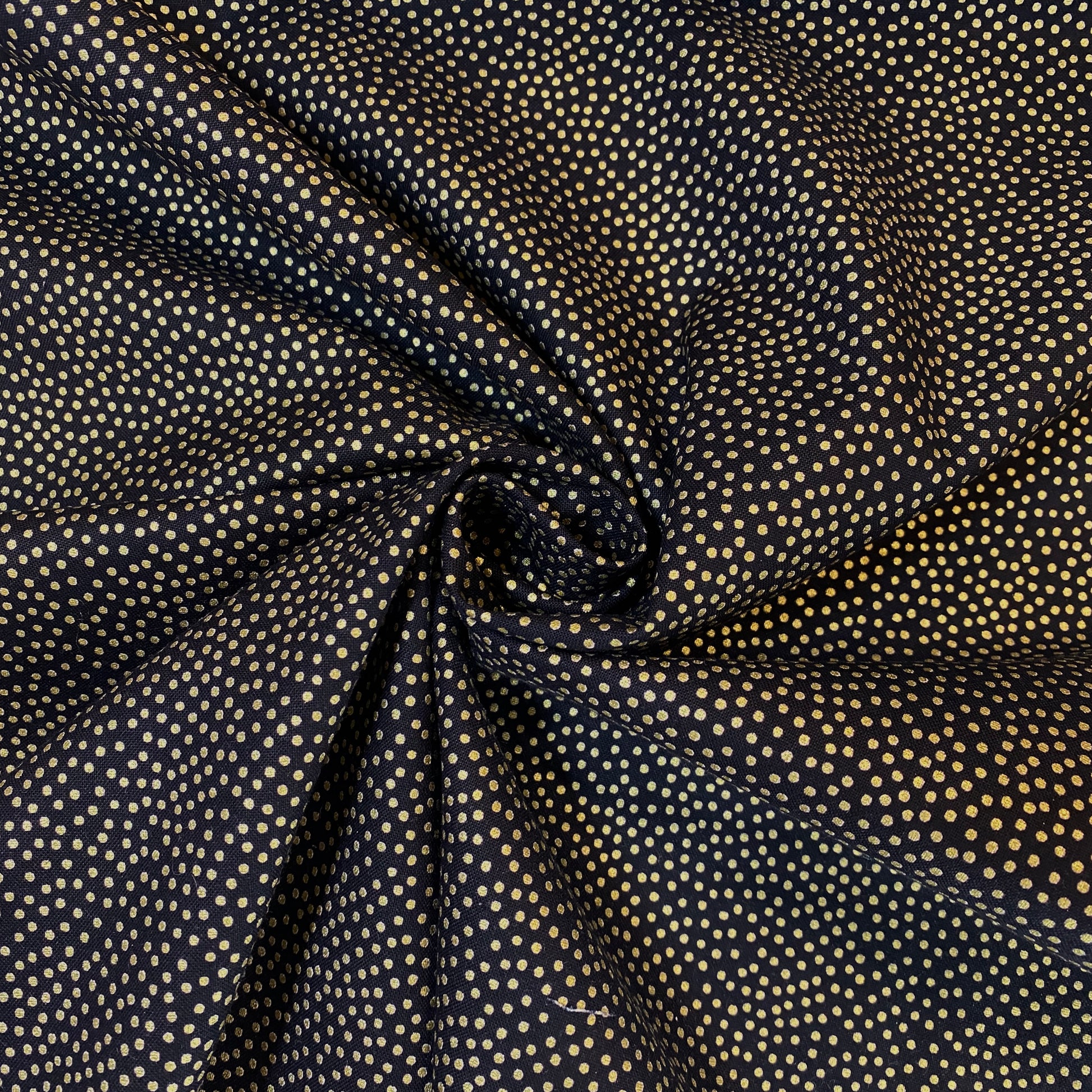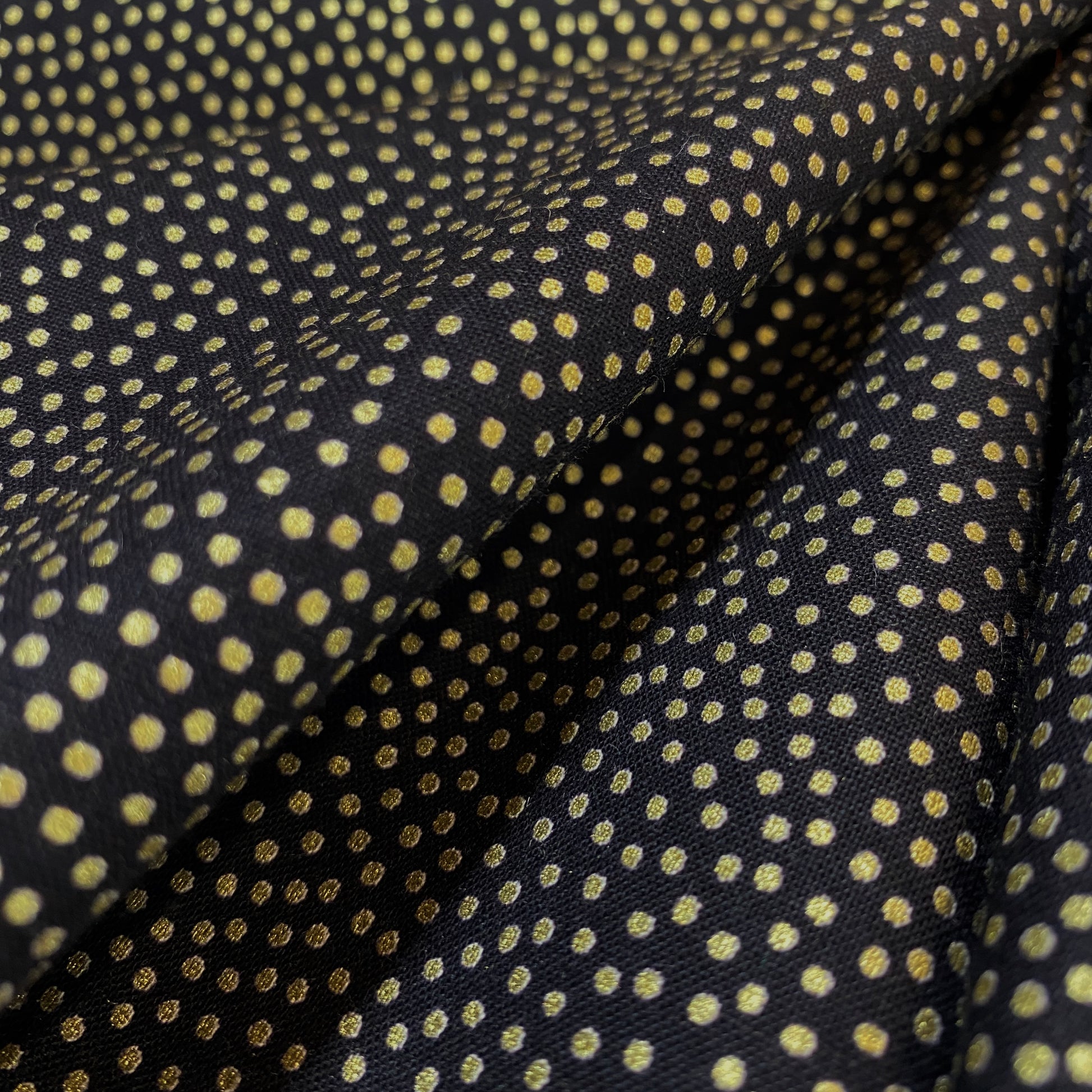 Tissu en 100% coton noir à pois dorés. Il est idéal pour la réalisation d'accessoires : sacs, trousses, taies d'oreiller,... comme pour la réalisation de vêtements : robe, chemisier, top,... C'est un coton tissé serré, il est donc un peu plus épais et plus résistant que la popeline de coton.