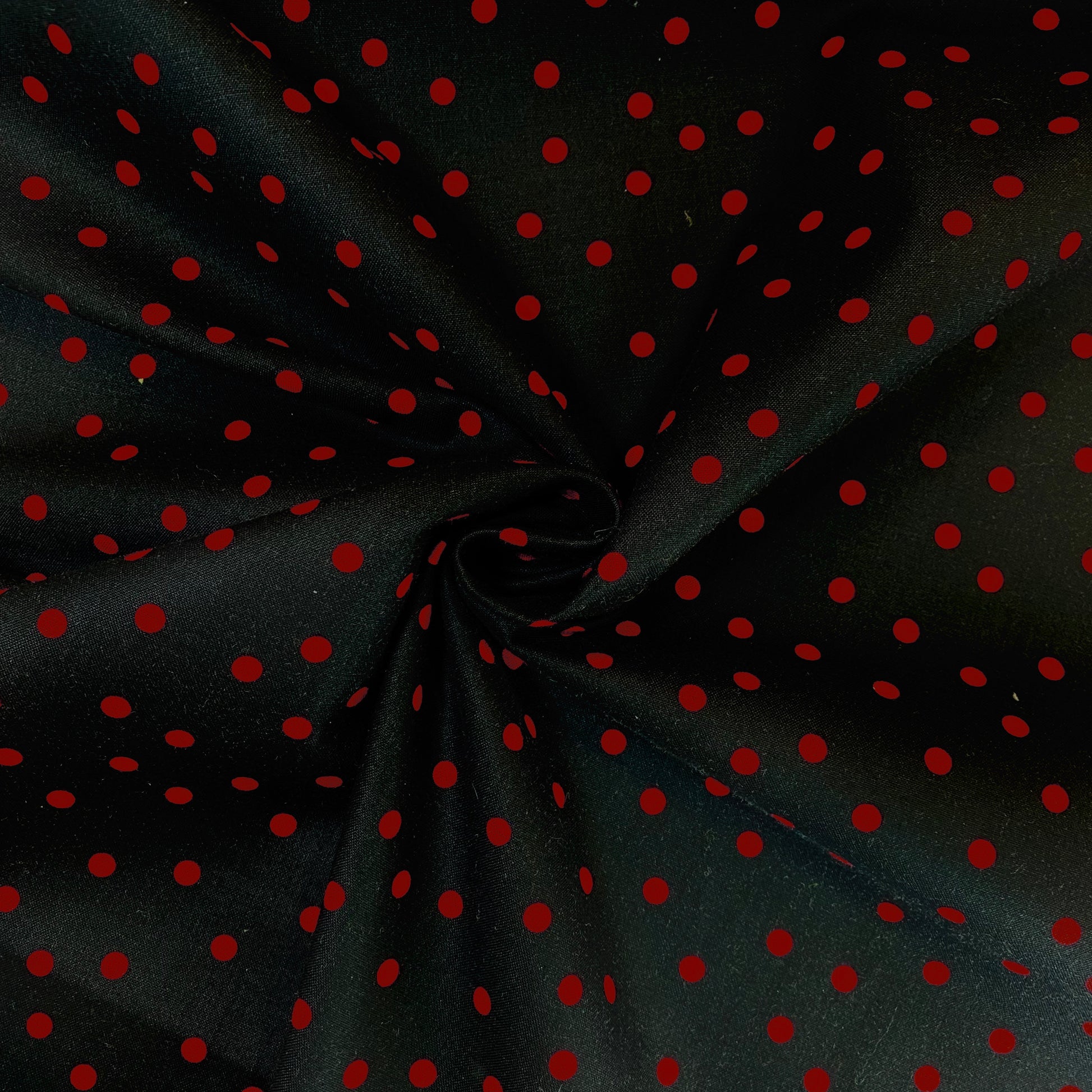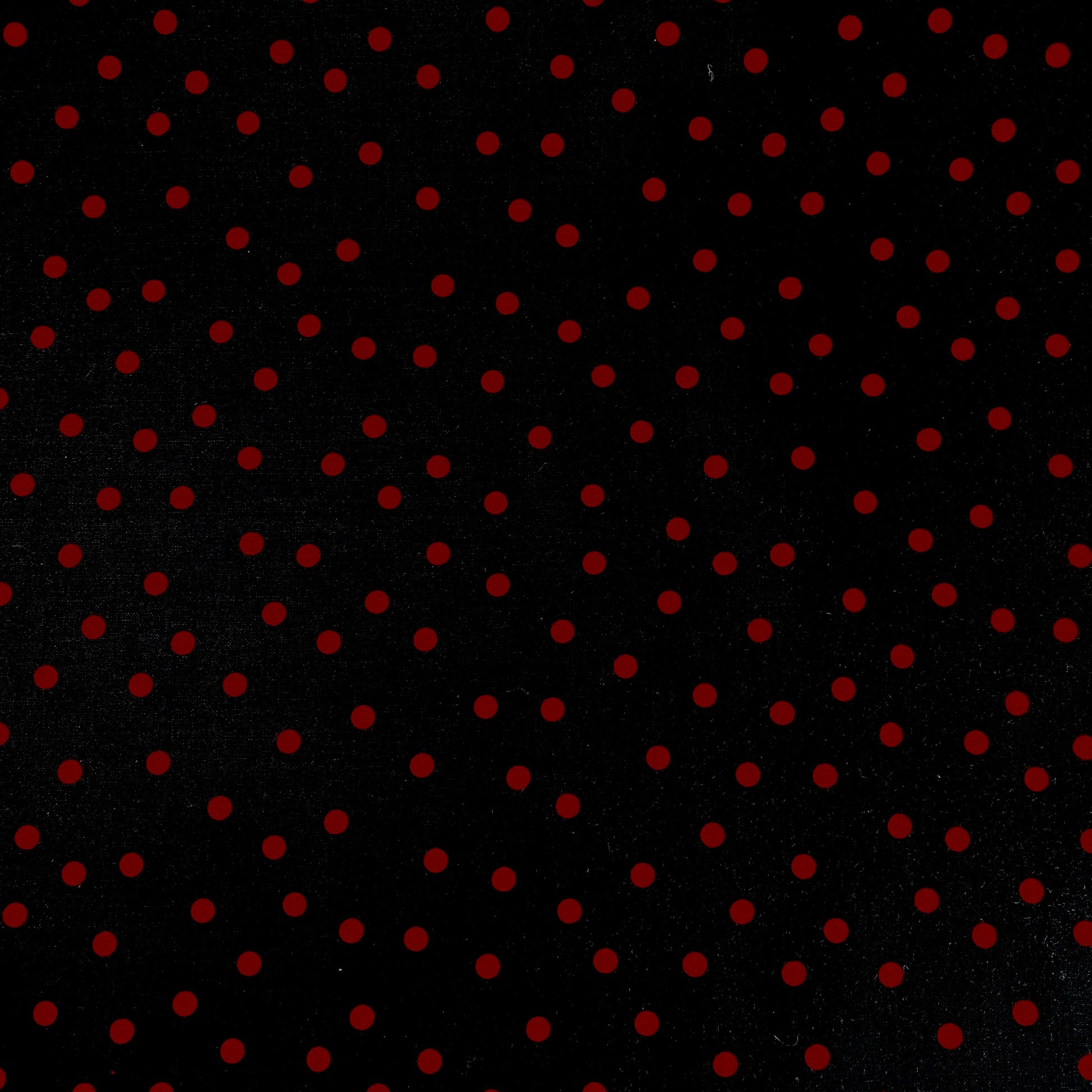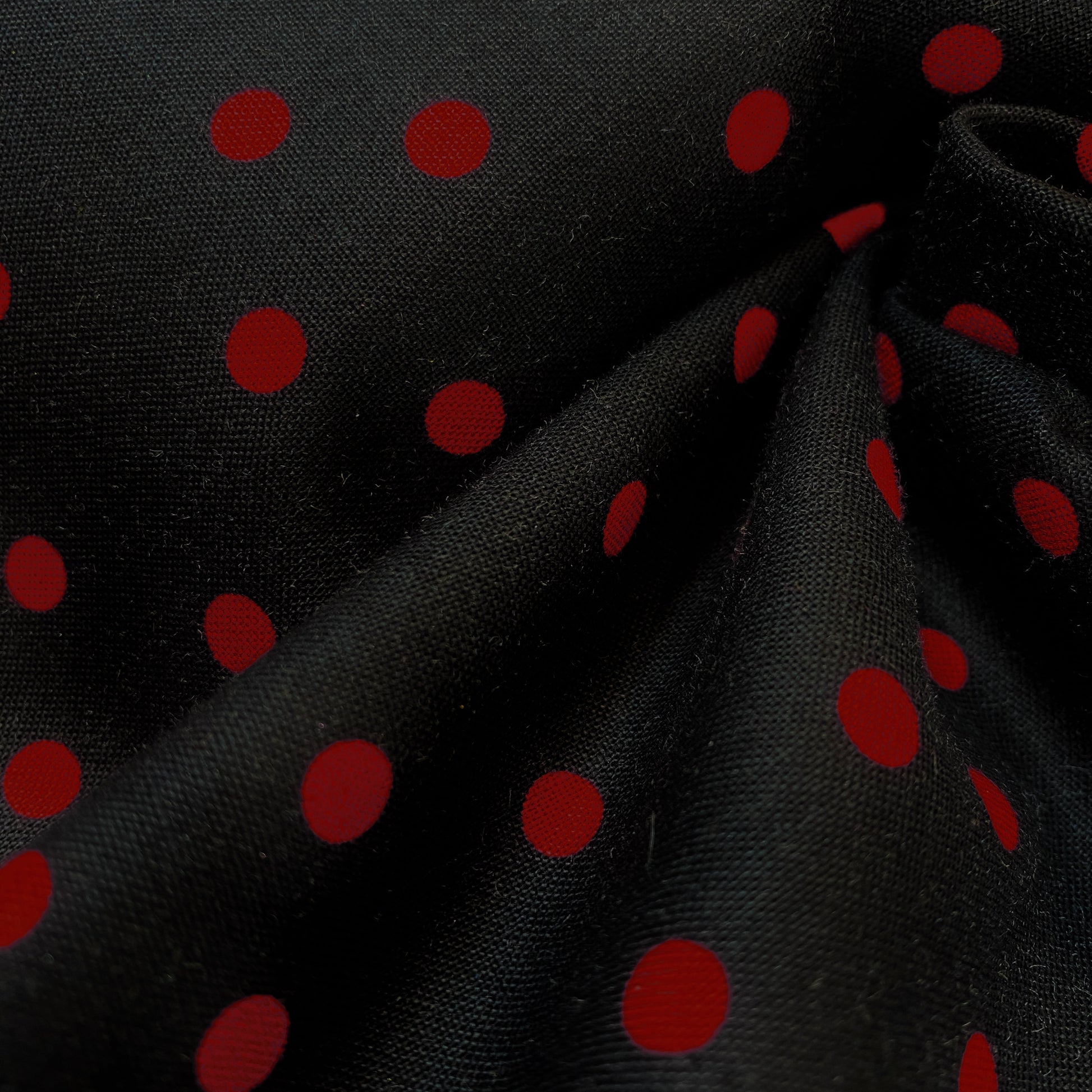 Tissu en 100% coton noir à pois rouges. Il est idéal pour la réalisation d'accessoires : sacs, trousses, taies d'oreiller,... comme pour la réalisation de vêtements : robe, chemisier, top,... C'est un coton tissé serré, il est donc un peu plus épais et plus résistant que la popeline de coton.