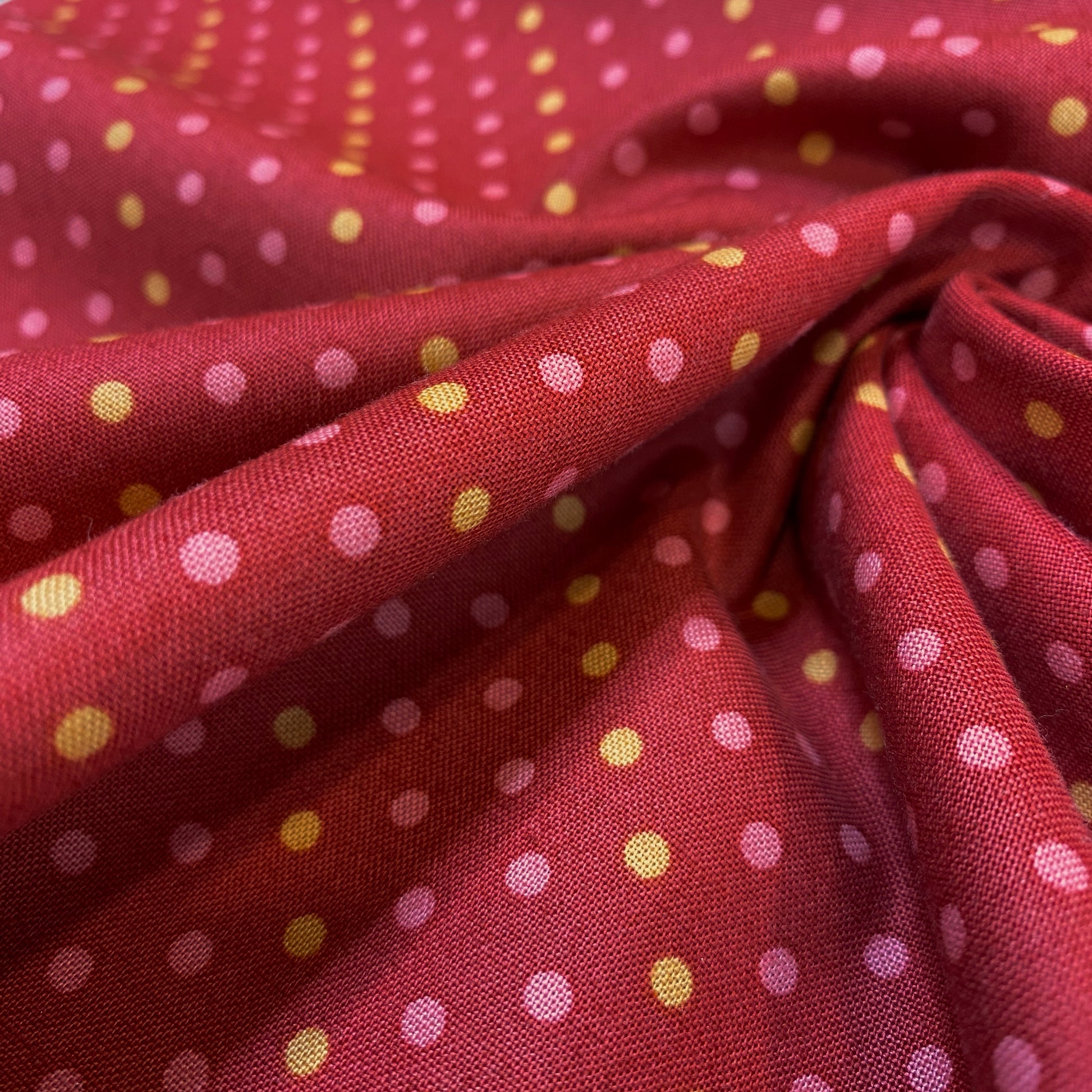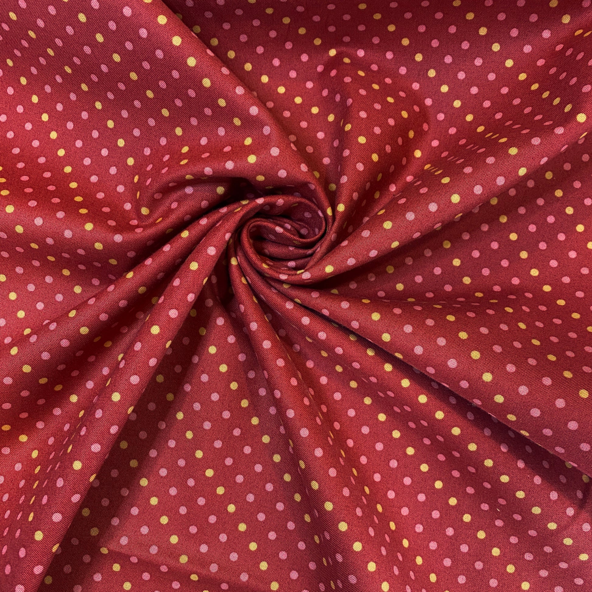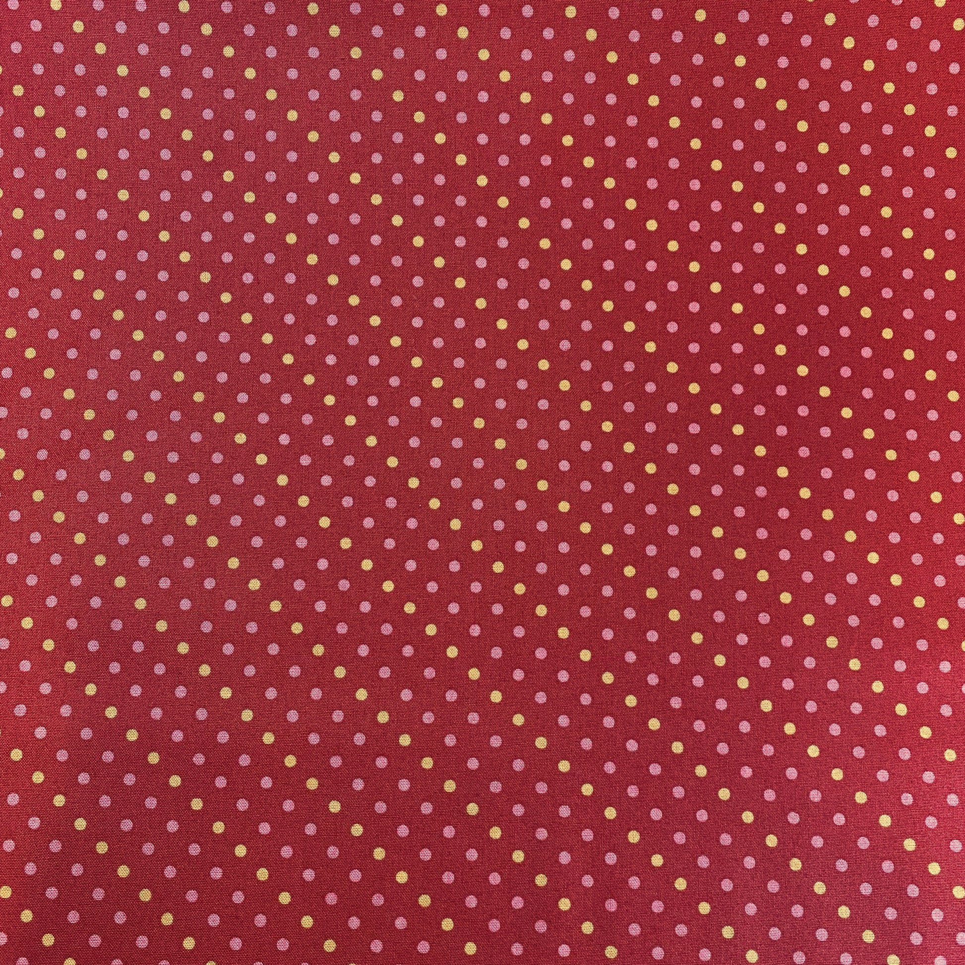 Tissu en 100% coton rouge à pois jaunes et roses. Il est idéal pour la réalisation d'accessoires : sacs, trousses, taies d'oreiller,... comme pour la réalisation de vêtements : robe, chemisier, top,... C'est un coton tissé serré, il est donc un peu plus épais et plus résistant que la popeline de coton.