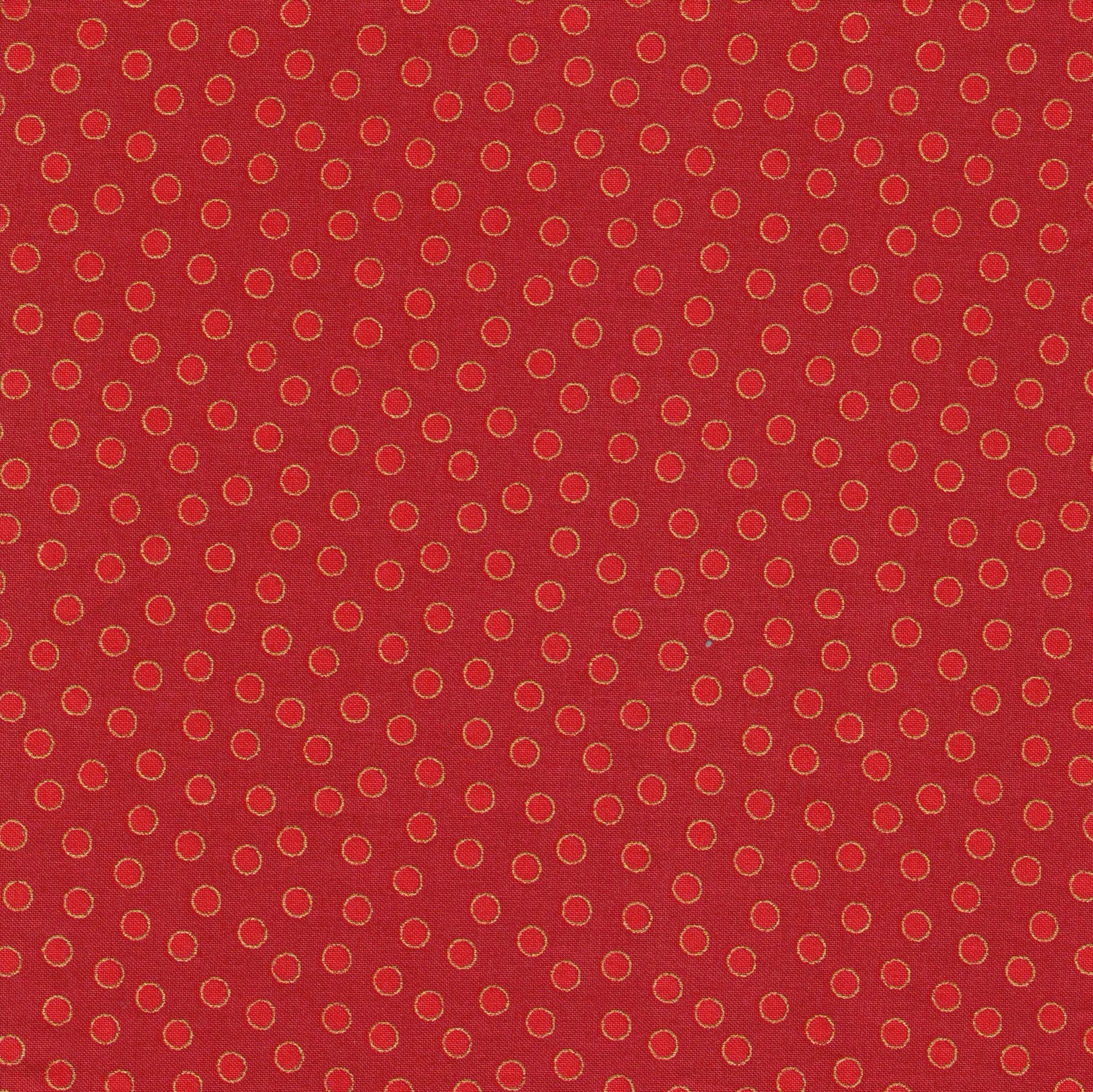 Tissu en 100% coton rouge à pois rouges cerclés d'or. Il est idéal pour la réalisation d'accessoires : sacs, trousses, taies d'oreiller, sacs à tarte, tabliers... comme pour la réalisation de vêtements : robe, chemisier, top,... C'est un coton tissé serré, il est donc un peu plus épais et plus résistant que la popeline de coton. Il peut convenir pour le cartonnage.