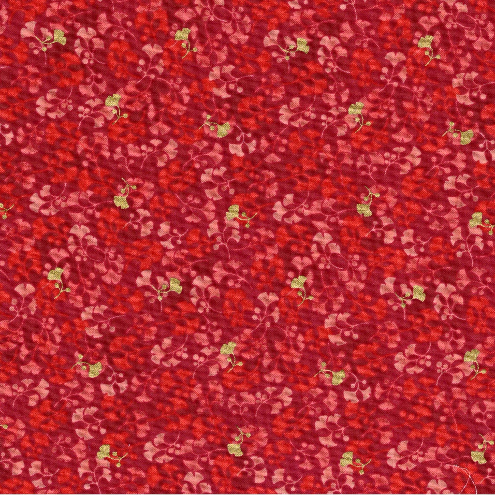 Tissu en 100% coton rouge à imprimés feuilles de gingko biloba. Il est idéal pour la réalisation d'accessoires : sacs, trousses, taies d'oreiller, sacs à tarte, tabliers... comme pour la réalisation de vêtements : robe, chemisier, top,... C'est un coton tissé serré, il est donc un peu plus épais et plus résistant que la popeline de coton. Il peut convenir pour le cartonnage.