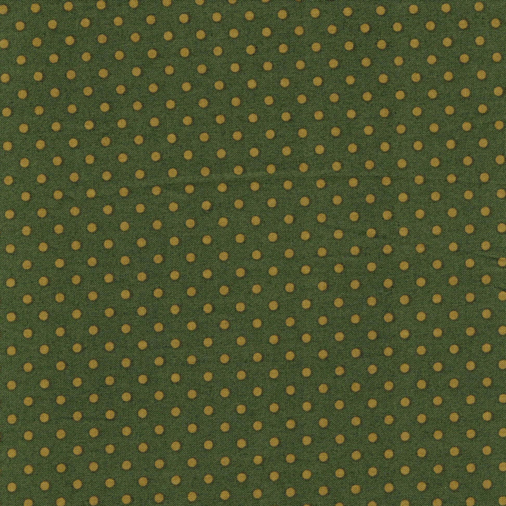 Tissu en 100% coton à pois moutarde sur fond vert kaki. Il est idéal pour la réalisation d'accessoires : sacs, trousses, taies d'oreiller, sacs à tarte, tabliers... comme pour la réalisation de vêtements : robe, chemisier, top,... C'est un coton tissé serré, il est donc un peu plus épais et plus résistant que la popeline de coton. Il peut convenir pour le cartonnage.