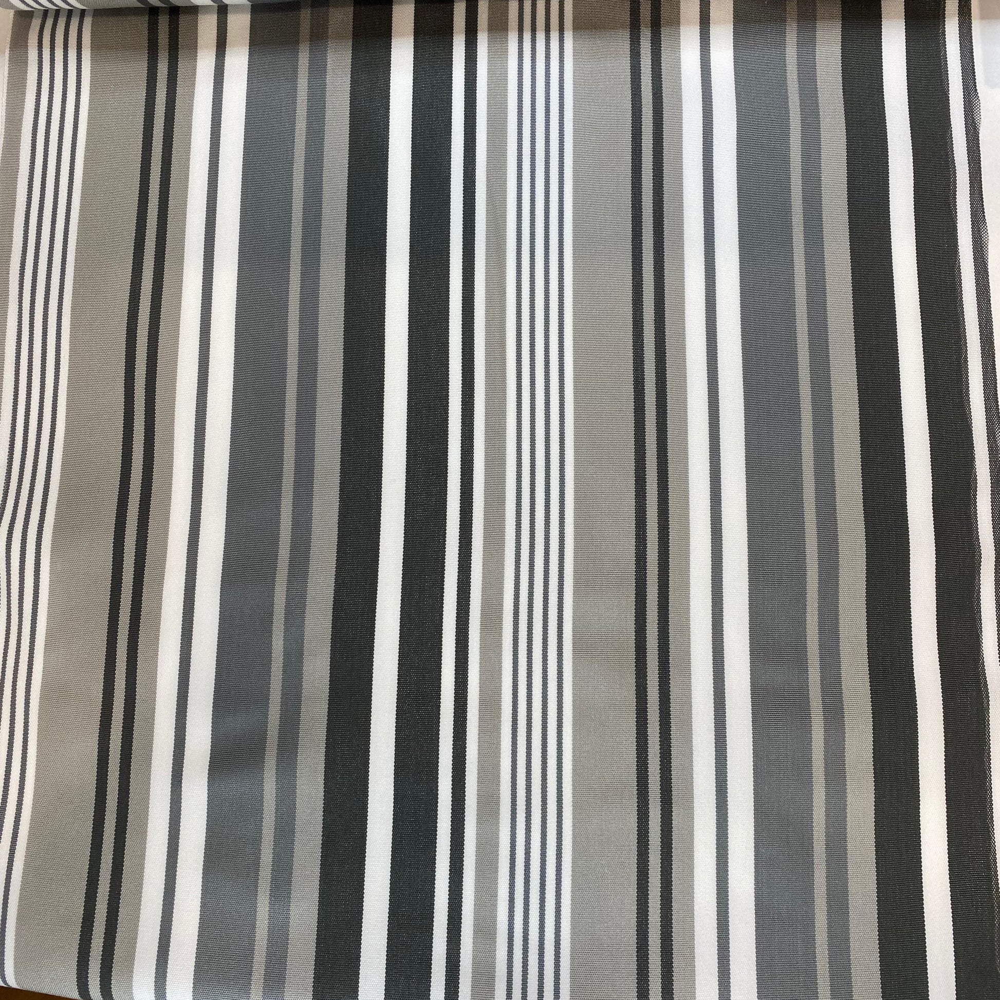 Toile à transat rayée gris et blanc. Ce tissu est un tissu technique qui est dédié à la réalisation de transat. Il peut aussi être employé dans d'autres circonstances mais il est déconseillé de le couper dans la largeur aux risques que le tissage ne se défasse, donc si vous souhaitez l'utiliser pour faire un sac par exemple, il faudra le laisser en largeur complète afin de ne pas le fragiliser.