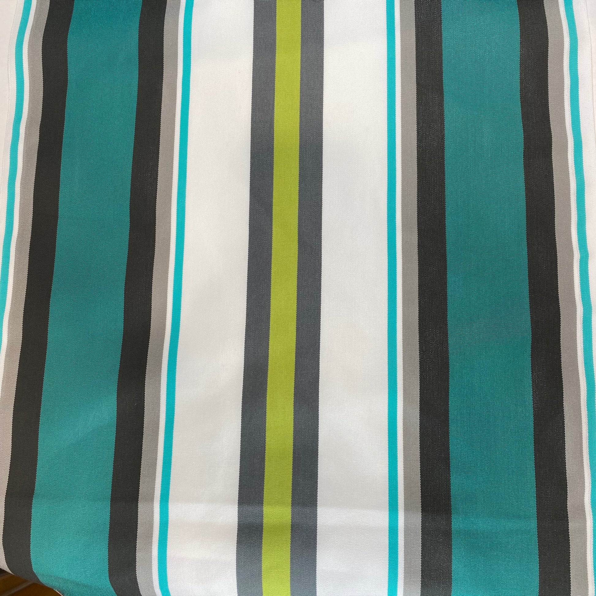 Toile à transat rayée gris, vert, bleu et blanc. Ce tissu est un tissu technique qui est dédié à la réalisation de transat. Il peut aussi être employé dans d'autres circonstances mais il est déconseillé de le couper dans la largeur aux risques que le tissage ne se défasse, donc si vous souhaitez l'utiliser pour faire un sac par exemple, il faudra le laisser en largeur complète afin de ne pas le fragiliser.