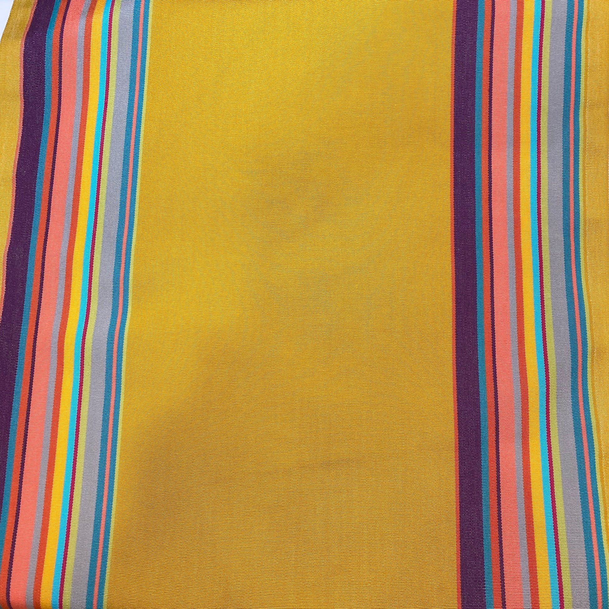 Toile à transat rayée fond moutarde et rayures multicolores. Ce tissu est un tissu technique qui est dédié à la réalisation de transat. Il peut aussi être employé dans d'autres circonstances mais il est déconseillé de le couper dans la largeur aux risques que le tissage ne se défasse, donc si vous souhaitez l'utiliser pour faire un sac par exemple, il faudra le laisser en largeur complète afin de ne pas le fragiliser.