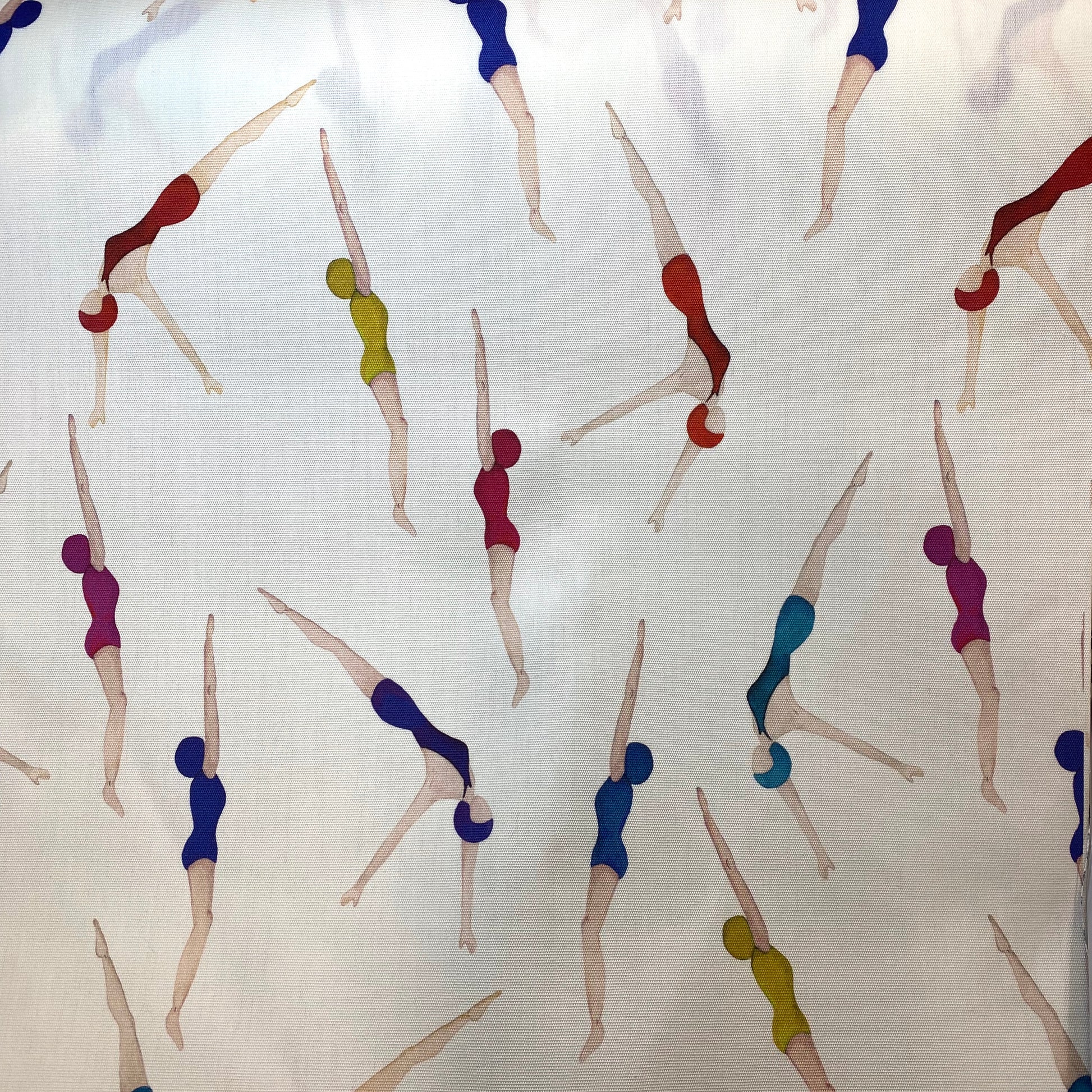 Toile à transat imprimé nageuses blanches. Ce tissu est un tissu technique qui est dédié à la réalisation de transat. Il peut aussi être employé dans d'autres circonstances mais il est déconseillé de le couper dans la largeur aux risques que le tissage ne se défasse, donc si vous souhaitez l'utiliser pour faire un sac par exemple, il faudra le laisser en largeur complète afin de ne pas le fragiliser.
