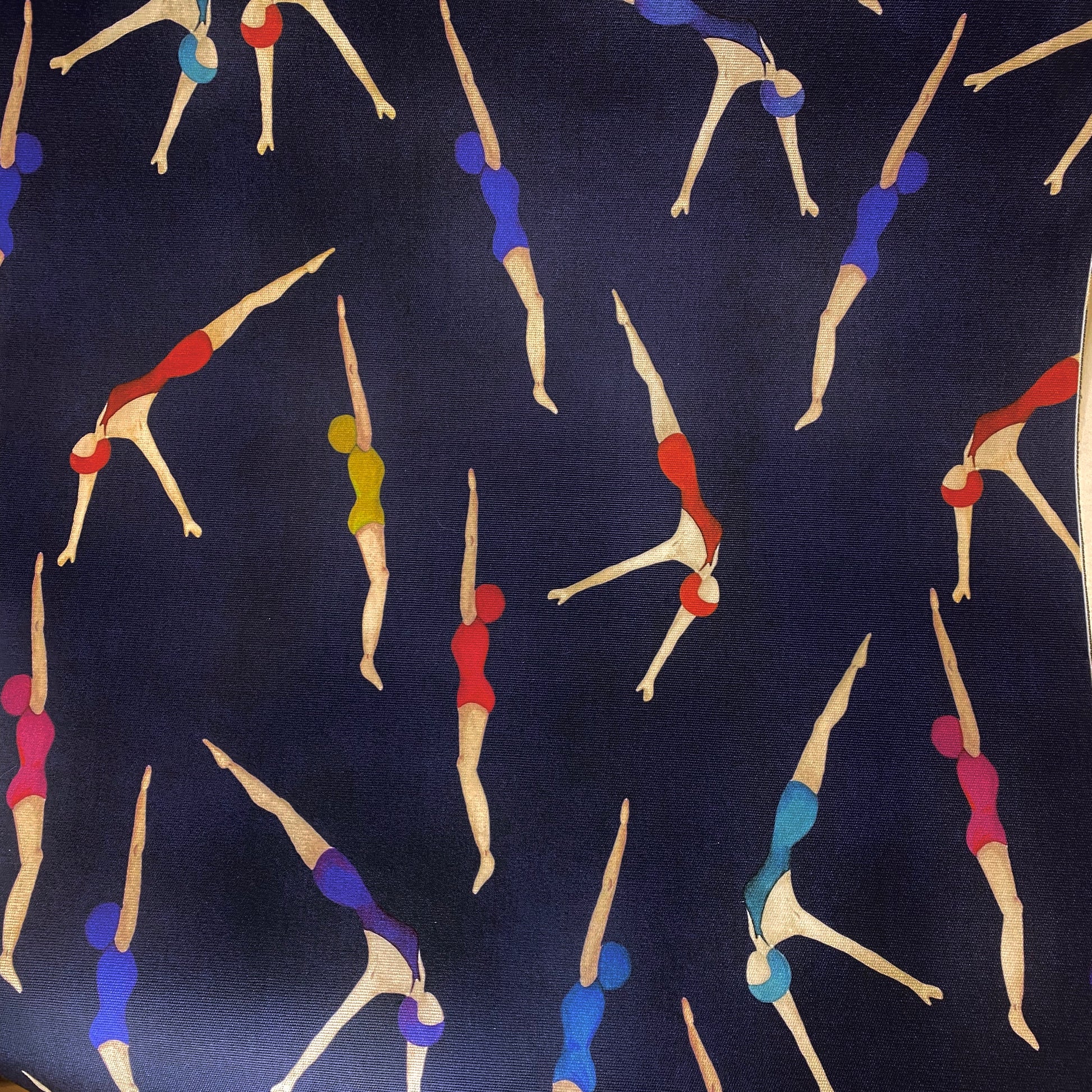 Toile à transat imprimé nageuses bleues. Ce tissu est un tissu technique qui est dédié à la réalisation de transat. Il peut aussi être employé dans d'autres circonstances mais il est déconseillé de le couper dans la largeur aux risques que le tissage ne se défasse, donc si vous souhaitez l'utiliser pour faire un sac par exemple, il faudra le laisser en largeur complète afin de ne pas le fragiliser.